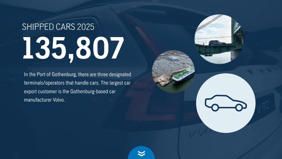 In the Port of Gothenburg, there are three designated terminals/operators that handle cars. The largest car export customer is the Gothenburg-based car manufacturer Volvo.